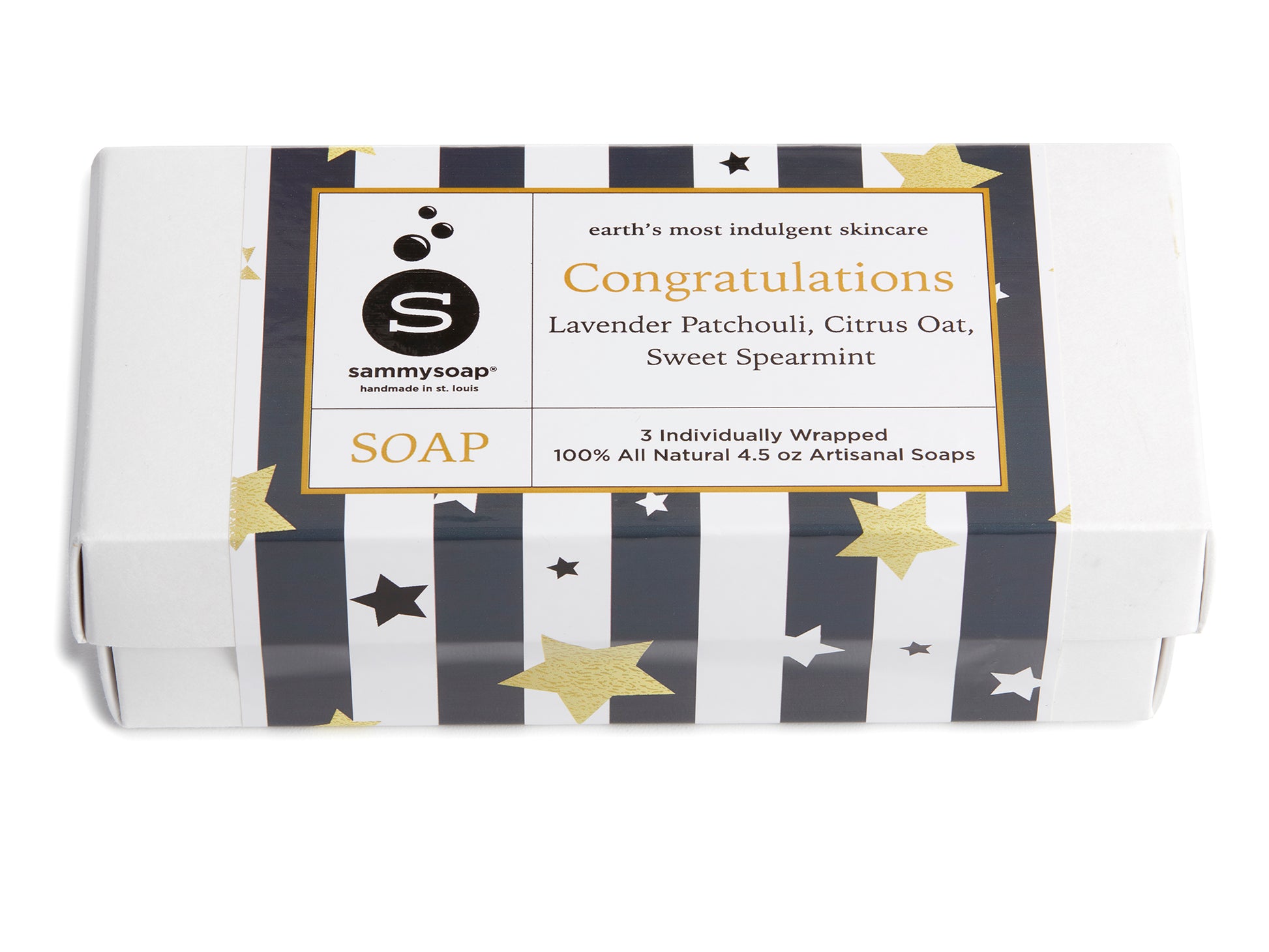 Three individually wrapped 100% all natural 4.5 oz artisanal soaps offered in a gorgeous gift box.