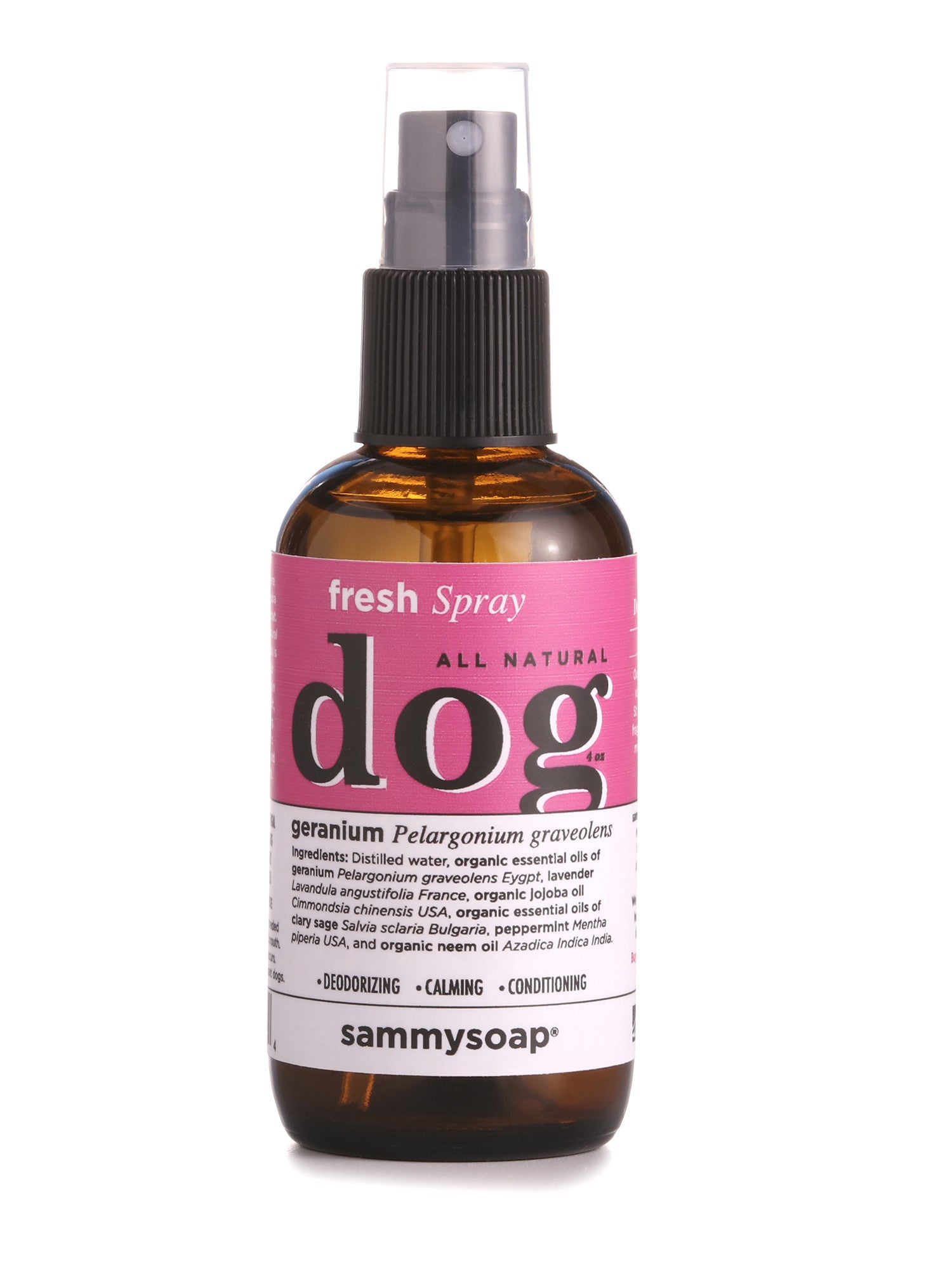 sammysoap All Natural Dog Spray Fresh Geranium is naturally vegan, 100% synthetic free, and handmade in St. Louis, Missouri.
