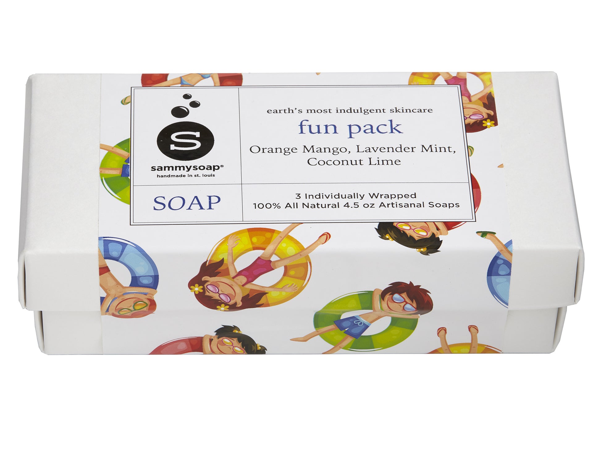 Three best selling individually wrapped all natural 4.5 oz artisanal soaps in a fun family, summer-themed gift box.