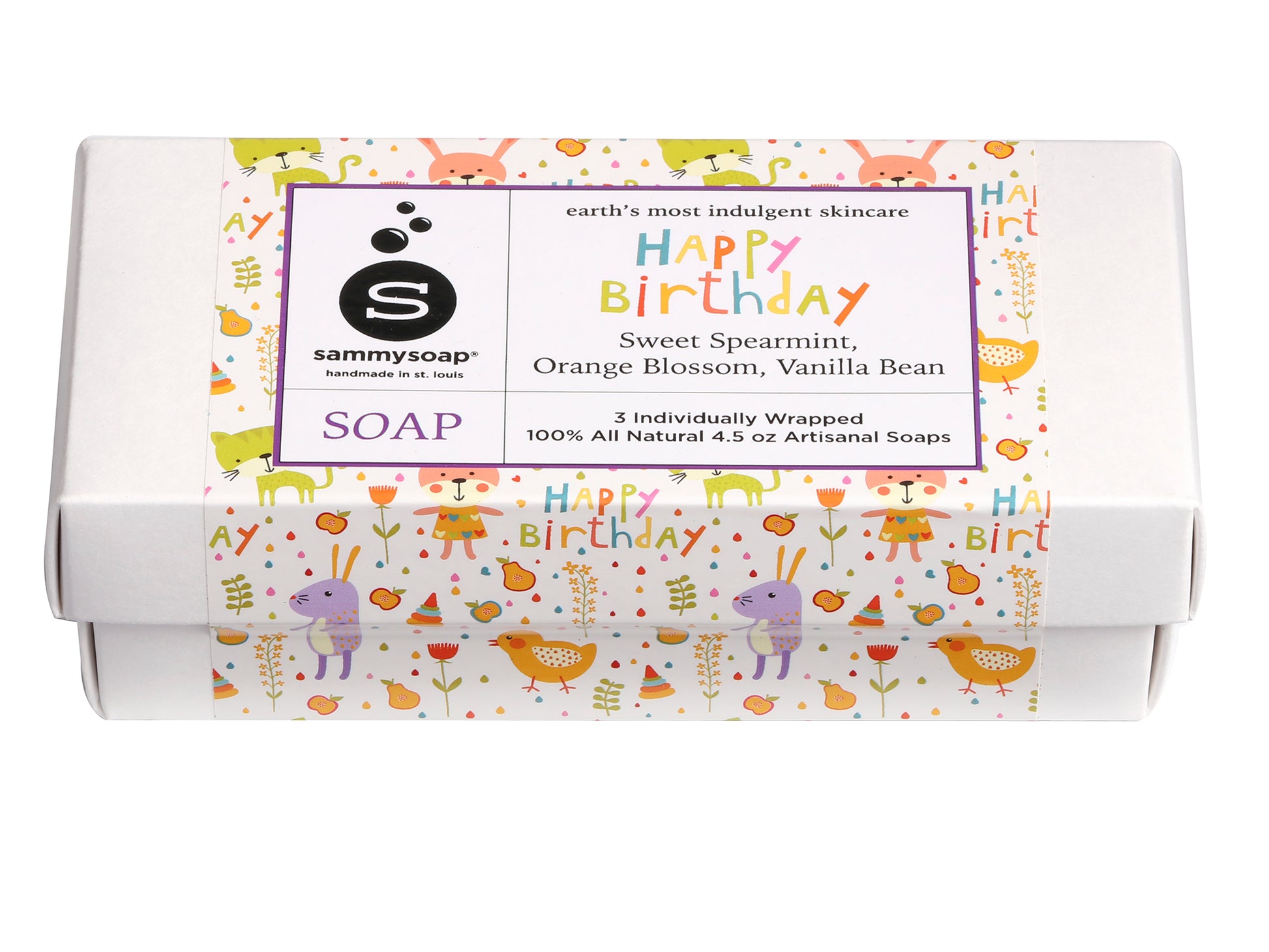 Three individually wrapped 4.5 ounce 100% all natural artisanal soaps in an attractive gift box.
