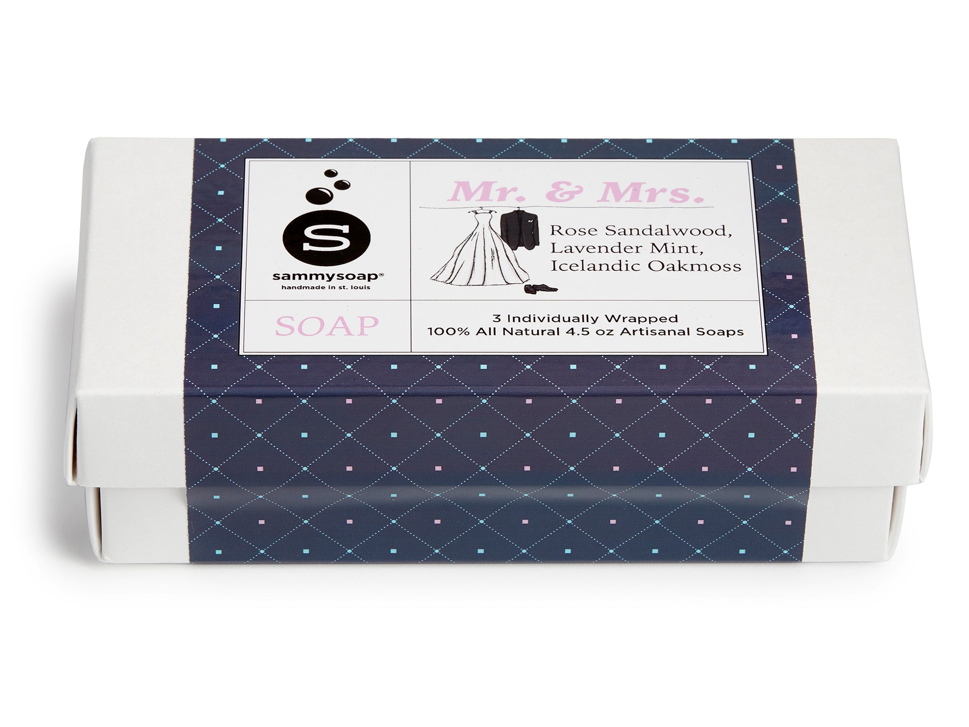 Three individually wrapped 100% all natural 4.5 oz artisanal soaps offered in an elegant gift box.