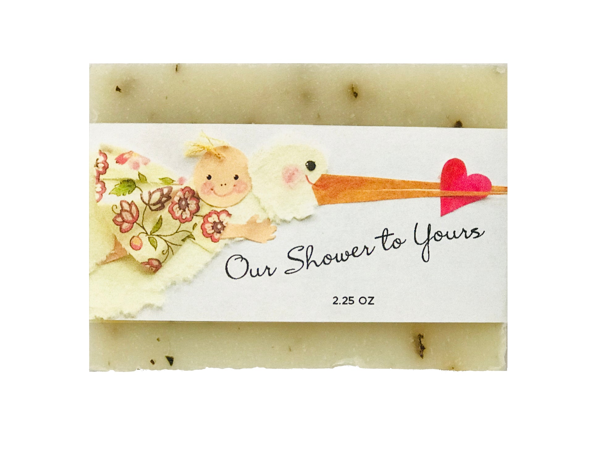 Our Shower to Yours is a 100% all natural artisanal bar soap for face and body wrapped in textured linen paper with original stork design for baby showers. Delight the mother to be and guests with a thoughtful and luxurious custom treat that's on theme.