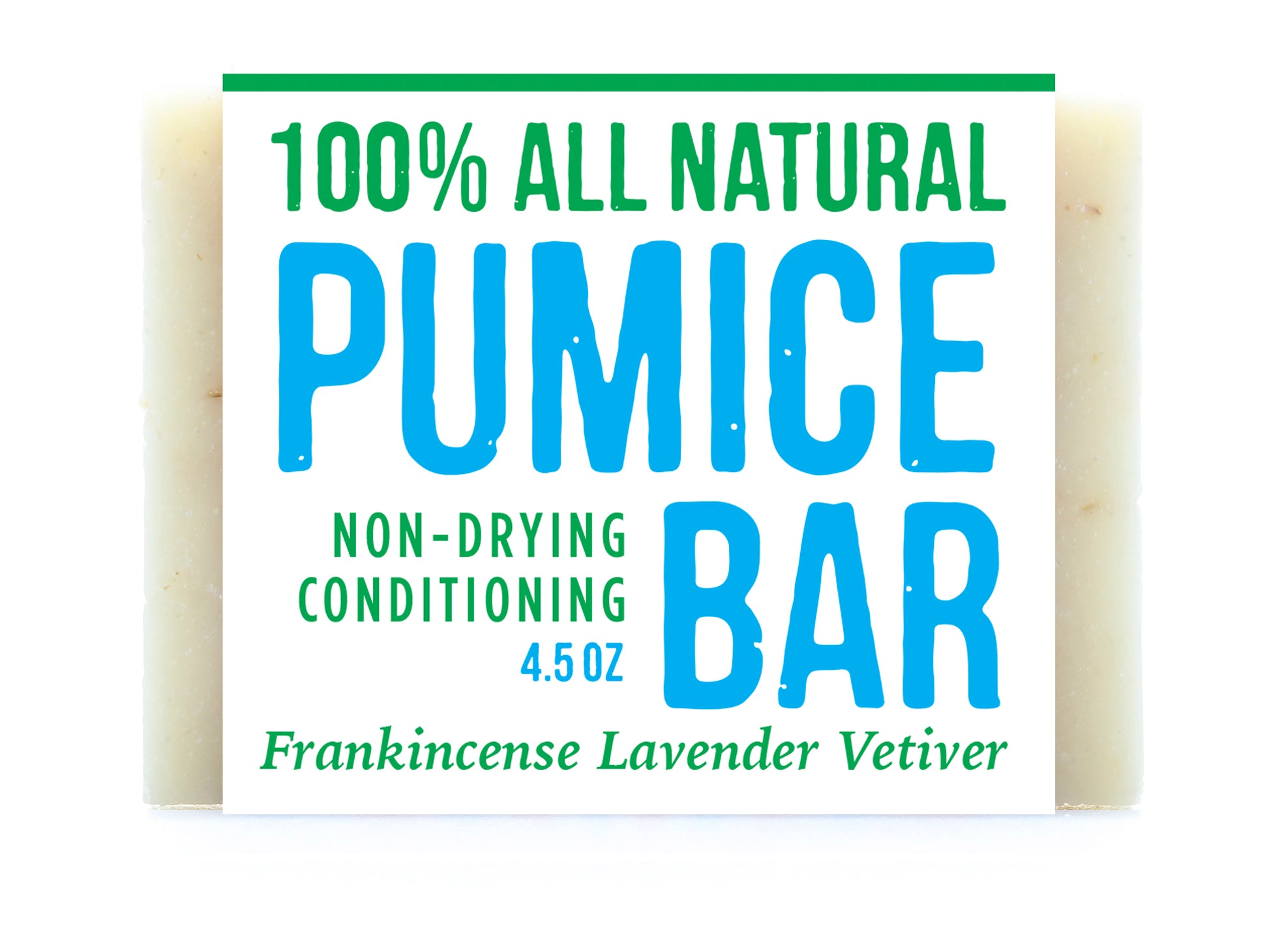 Saponified food grade oils of rice, palm, and castor bean, with organic unrefined shea nut butter, finely ground pumice stone, and essential oils of frankincense, lavender, vetiver, and black pepper.