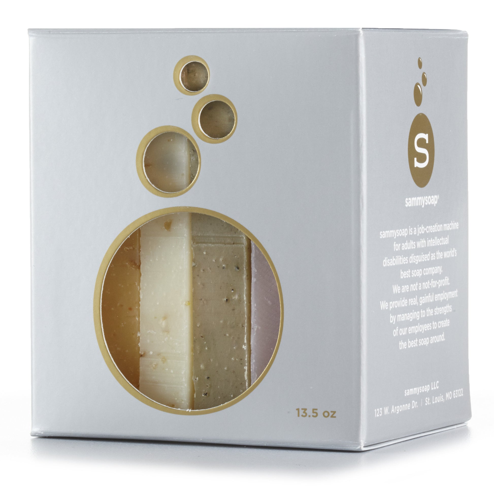 Everybody loves high quality soaps. The sammysampler has always been one of our most popular gifts. Each soap is 100% all natural, vegan, and made in small batches by hand in St. Louis, Missouri. No artificial Anything. sammysoap is a job creation machine for adults with intellectual and developmental disabilities disguised as the world's best soap company. We exist in support of human health, a clean planet, and wage equality. Our mission is noted on every box.