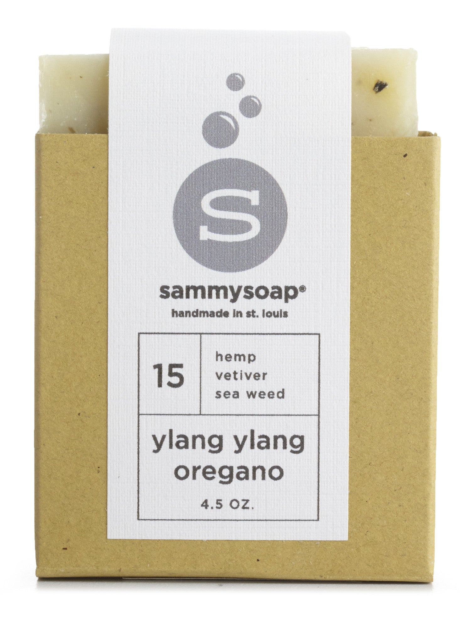 Saponified food grade oils of rice Oryza sativa, palm Elaesis guineensis, soy Glycine max and castor bean Ricinus communes, with essential oil of ylang ylang Cananga odorata Madagascar, hemp seed oil Cannabis saliva Canada, essential oil of oregano Origanum vulgare Hungry, essential oil of patchouli Pogostemon cablin Indonesia, essential oil of vetiver Vetiveria zizanioides Haiti, and seaweed Ascophyllum nodosum.